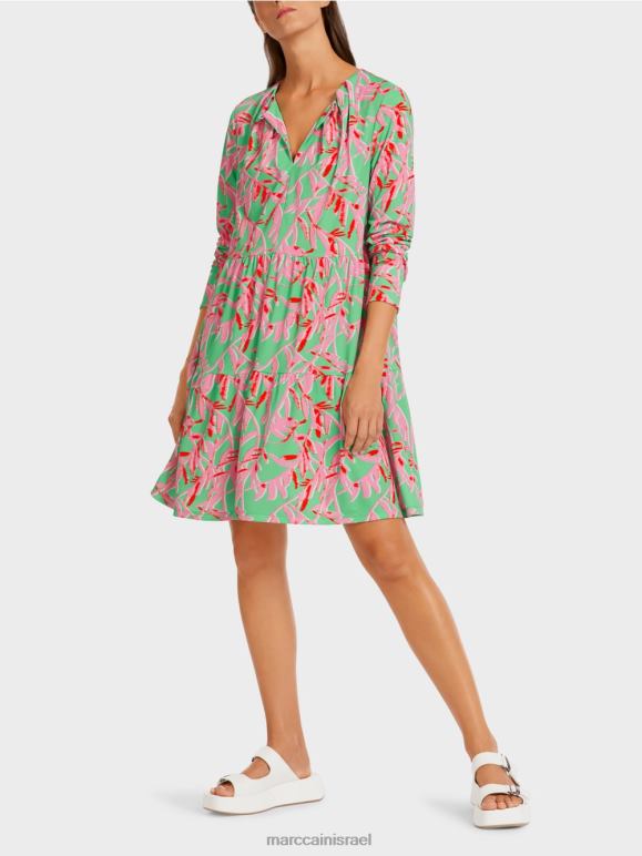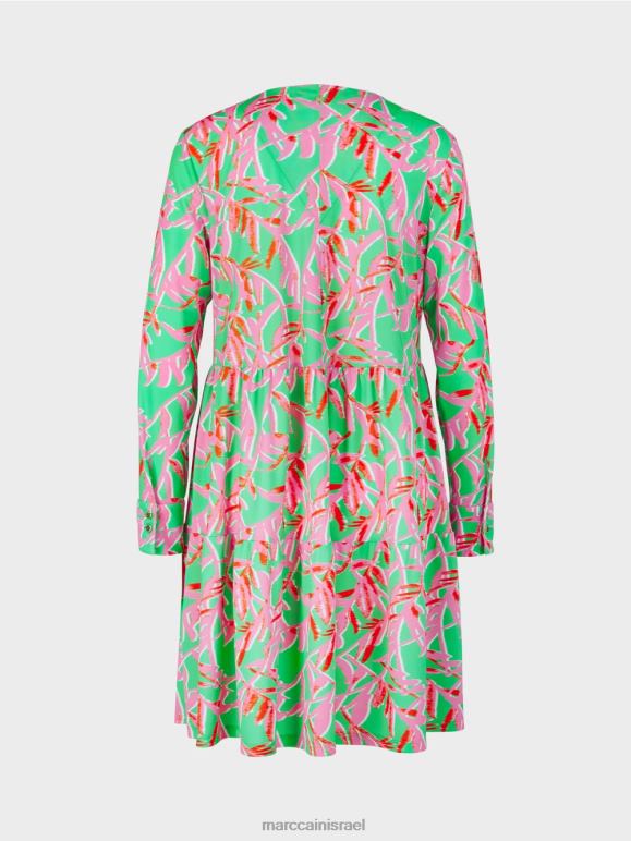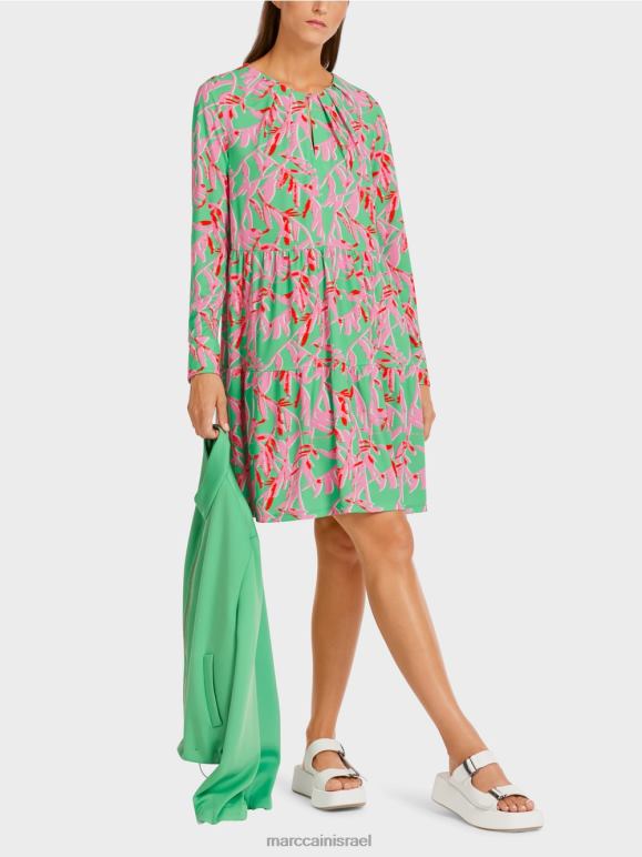 שמלה רפויה בדוגמה פרחונית. צוואר צוואר עם קפלים מוסיף פרט מושך את העין לשמלה הזו. הוא מהודק עם כפתור מתכת דיסקרטי. החצאית מגיעה בפלונים מדורגים. לשרוולים שני כפתורים על השרוול.