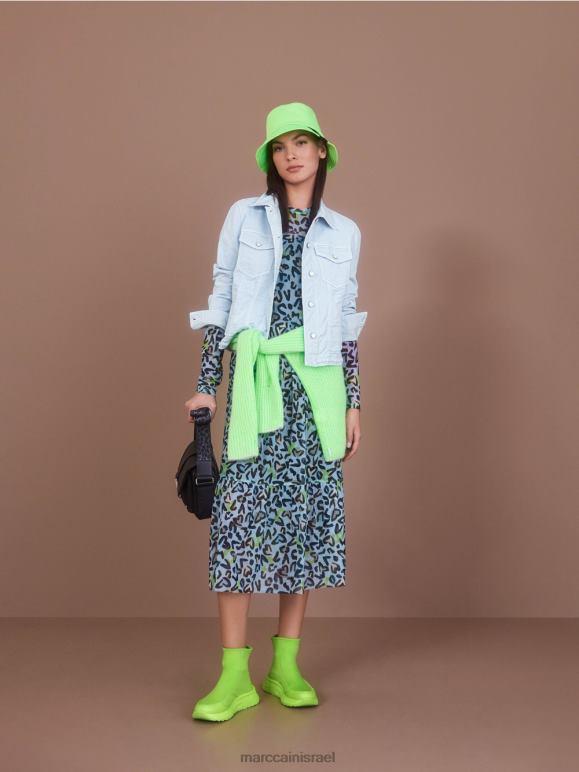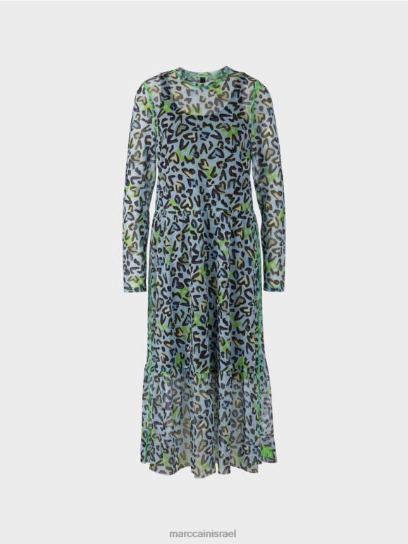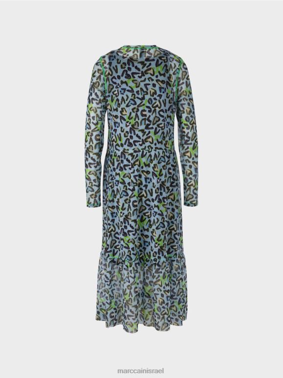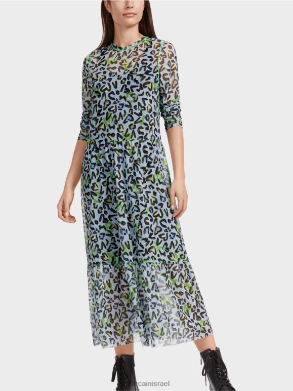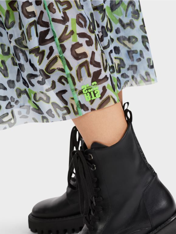 השמלה עשויה מג'רזי טול רך וגמיש. החומר הוא חצי שקוף. האטימות ניתנת על ידי הבטנה. הצורה מחבקת את הגוף בחלק העליון ומתנדנדת החוצה בשוליים. הדפס הכל אובר המגניב מזכיר את האסתטיקה של האמן Keith Haring. תפרי אוברלוק ניאון מעניקים לדגם מגע ספורטיבי.