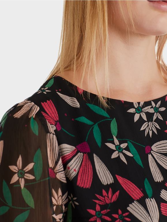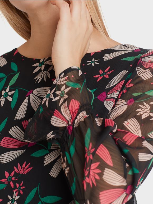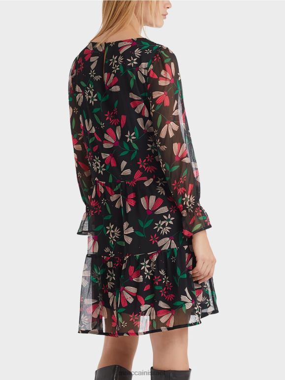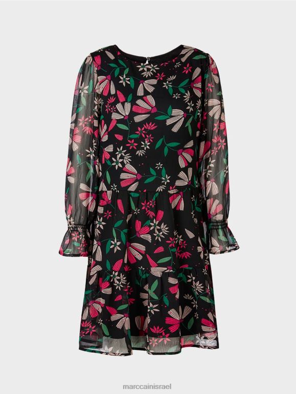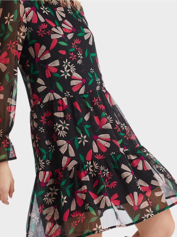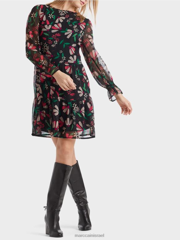 שמלה מסוגננת עם צללית מתנדנדת רחבה באיכות קרפ קלה אוורירית. השמלה הנשית מעוטרת כולה בהדפס פרחוני צבעוני. כפכפים מדורגים ופרטי חלוק עדינים על השרוולים מעניקים לשמלה מראה רומנטי.
