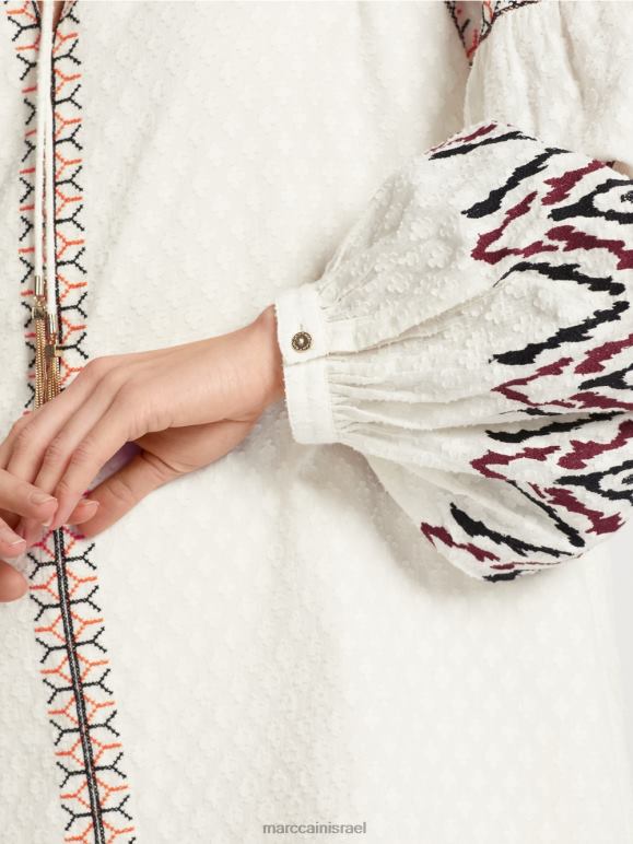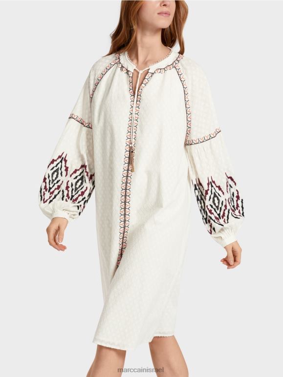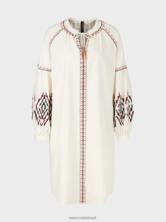 השמלה הזו עשויה מכותנה עדינה במיוחד עם דוגמה ארוגה פרחונית. הגימור הדו-שכבתי הופך אותו לאטום. הרקמה על התפרים והמחשוף היא בהשראת עיצובים אתניים. השרוולים המכונסים וואו עם המוטיב הרקום המסוגנן שלהם שמזכיר את טכניקת הצביעה של איקט. ניתן לקשור את קו הצוואר עם שרוך. ישנו אלמנט דקורטיבי דמוי ציצית העשוי משרשראות מתכת עדינות על החוט.