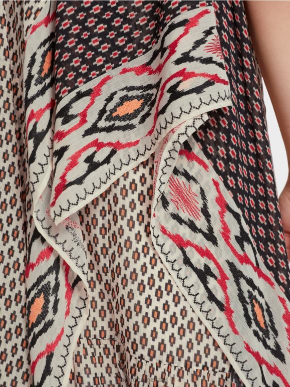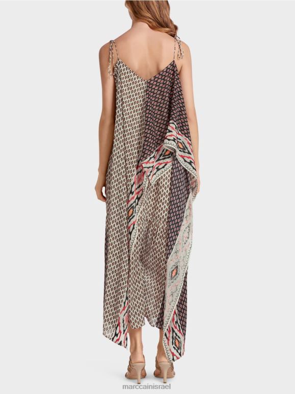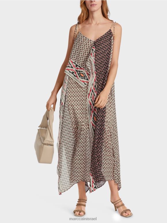 מבנה אלגנטי והדוגמאות המעורבות הופכות את השמלה הזו לייחודית. הגזרה הבסיסית היא שמלת החלקה בקו A עם גזרה נמוכה. החל מהדקולטה, לפריט יש פלונים נדיבים המסודרים בצורה א-סימטרית מלפנים וסימטרית מאחור. השמלה מרופדת.