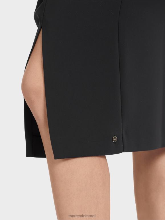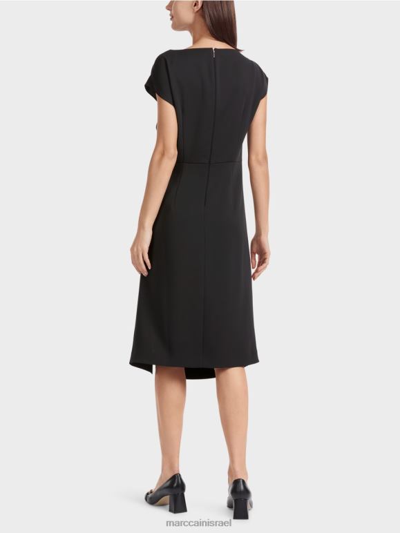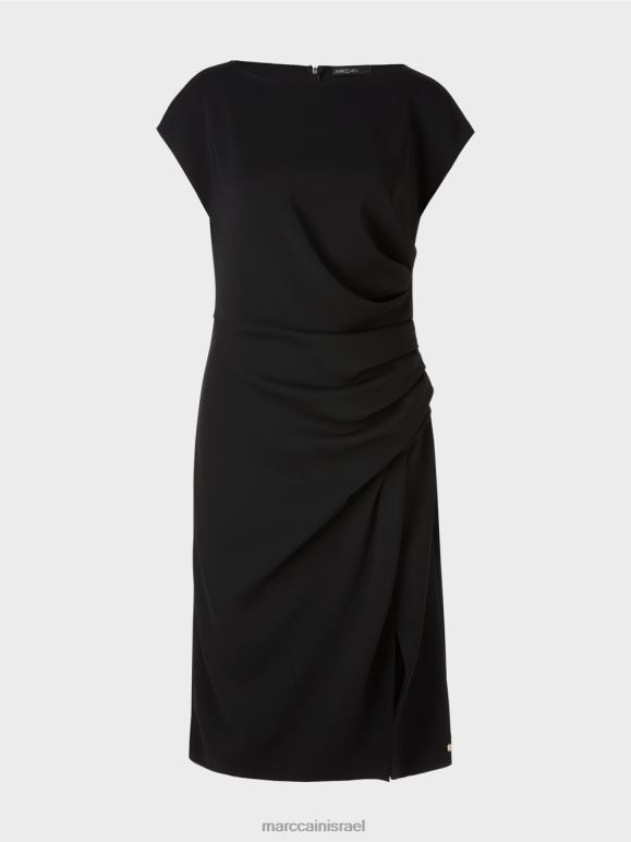 שמלה מחויטת בצורה אסימטרית מתערובת חומרים רכים. אפקט העטיפה בצד שמאל נותן לשמלה הנמתחת מגע ספורטיבי. הוא חובק דמות עם חרך הליכה נעים. את העיצוב ללא שרוולים משלימים קו צווארון ורוכסן נסתר מאחור.