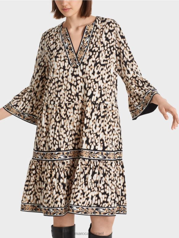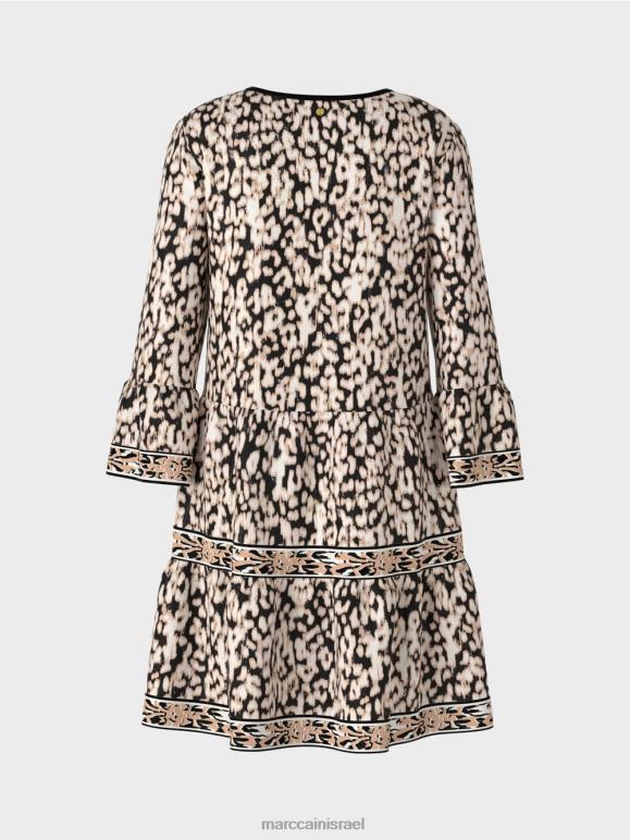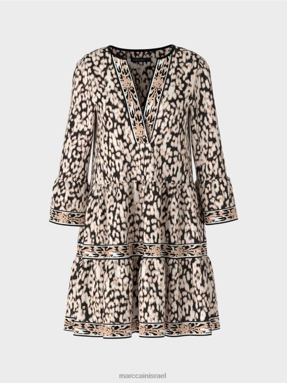 שמלה רפויה עם חצאית מתנדנדת והדפס נמר אבסטרקטי. שמלת נמר זו עשויה מבד ג'רסי נוח. שרוולי החצוצרה הארוכים, קצוות המחשוף והחצאית מתהדרים בפסים מודפסים המעוטרים בעצמם עם עיטור מודפס.