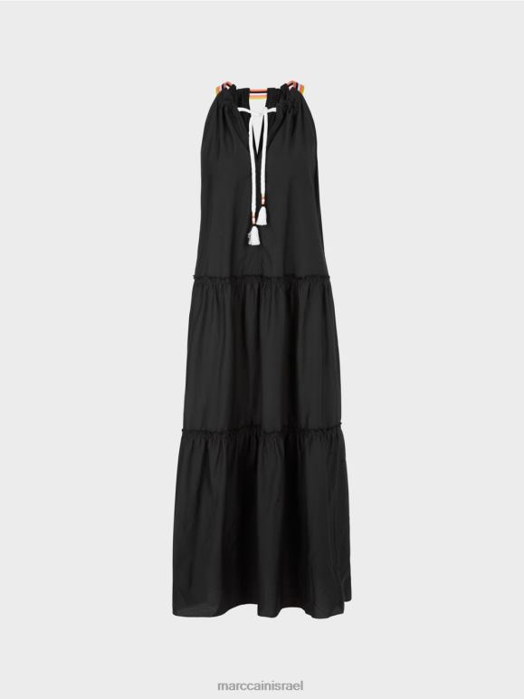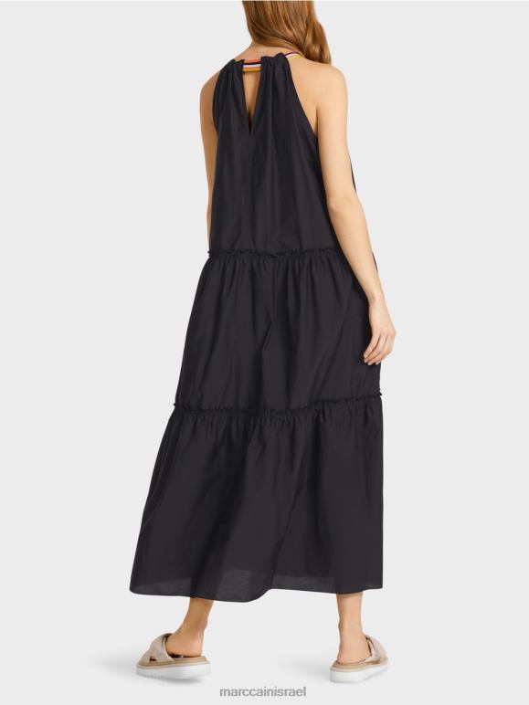 שמלה אופנתית בעיצוב ספורטיבי מכותנה ומשי. השמלה יוצאת הדופן הזו משלבת אלמנטים ספורטיביים עם פרטים אלגנטיים. יש לו צוואר קולר רומנטי שנאסף כלאחר יד על ידי חוט ומקושט בסרט חוט צבעוני. ישנן חתכים בצורת V מלפנים ומאחור כדי להראות את השיזוף שלך. הכתמים על החצאית פירושם שהחתך מתמזג לצורת א-קו. כיסי צד משפרים את הנוחות.