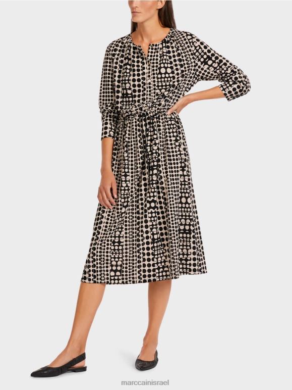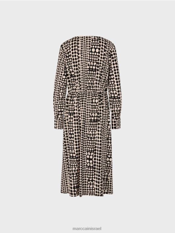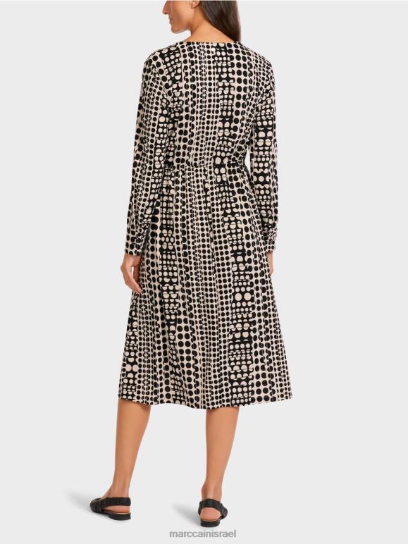 שמלה בהשראת הסגנון של שנות ה-70 עם דפוס אופ-ארט. קו הצווארון מוסיף נופך של אלגנטיות. חלק החצאית מחובר למחוך ויש לו שרוך להתאמת הרוחב.
