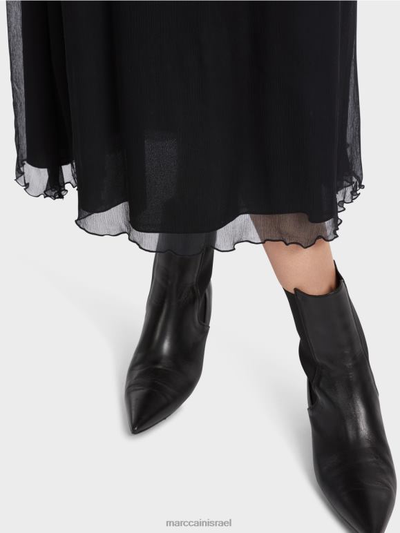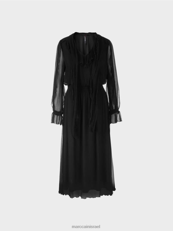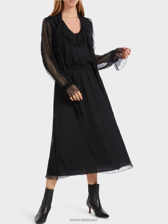 שמלת ויסקוזה עטויה ברכות בשיפון קמטים. פרטים מחורצים בשרוולים, במחשוף ובאזור הכתפיים מעניקים לשמלת המידי המעט שקופה הזו את המראה השובב שלה. את העיצוב משלים צווארון סתמי עם לולאות. המותן המעוטר יוצר צללית נשית. כמו כן, האזיקים של השרוולים מציגים את עצמם גם עם תוספת סמוקי.